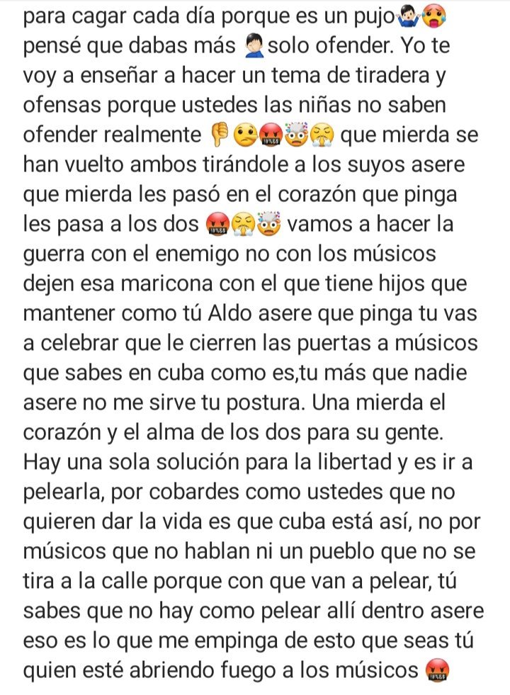1. No dejen q los pongan a pelear entre ustedes.es una tactica para destruirlos.alguien encontro esta moalidad y la llebo a la practica.somos cubanos.somos hermanos.no enemigos como quieren hacer ver.sigan hacia adelante con la musica q lo hacen bien.