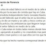 “Señor de 64 años de edad falleció en el medio de la calle en Moron Ciego de Ávila por los escases de comida que hay en Cuba.  Cuenta la periodista Independiente Dairis González Ravelo en consulta con la familia del fallecido que el señor iba en su bicicleta a buscar unos panes y le dio un mareo y se cayó y chocó con un contén”.