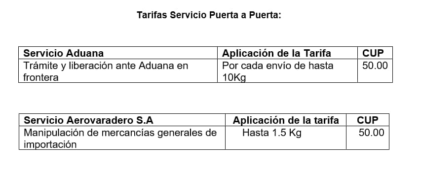 “En la fase experimental serán cobradas en un primer momento al cliente en Cuba. Las tarifas de Aerovaradero S.A se aplicarán con independencia de los cobros que procedan por concepto de trámites realizados por la Aduana (50.00 CUP) y pagos de aranceles aduanales, cuando excedan de los límites exentos de pago (superior a los 30.00 USD o 1.5 kg de misceláneas) y hasta 200.00 USD el valor del contenido)”, dice el informe.