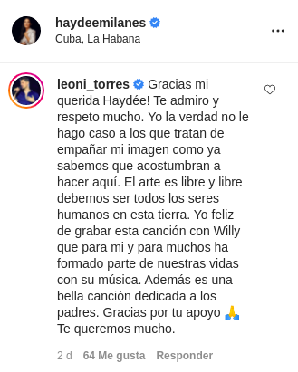 Fue precisamente en la publicación de Milanés en Instagram, donde Leoni, al tiempo que agradeció las palabras de la artista, adelantó que la colaboración con Chirino forma parte de una sorpresa que está preparando para el venidero día de los padres.