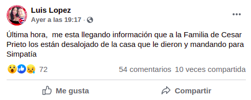 “Última hora, me está llegando información de que a la familia de César Prieto los están desalojando de la casa que le dieron y mandando para Simpatía”, aseveró el usuario.