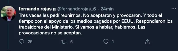 Por su parte Fernando Rojas, viceministro del Mincult, en un intento de justificar el ataque, recurre una vez más al discurso gastado del imperio que respalda estos actos espontáneos: “Tres veces les pedí reunirnos. No aceptaron y provocaron. Y todo el tiempo con el apoyo de los medios pagados por EEUU. Respondieron los trabajadores del Ministerio. Si vamos a hablar, hablemos. Las provocaciones no se aceptan”.