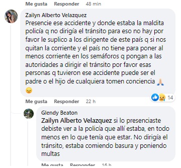 Otra de las testigos, identificada en redes como Zailyn Velázquez, reveló que los semáforos de ese cruzamiento se encontraban apagados, y que no había un agente de la policía regulando el flujo de los vehículos, por lo que el accidente era cuestión de tiempo.