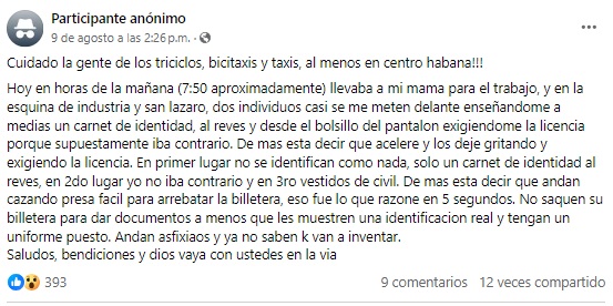 “Dos individuos casi se me meten delante, mostrándome a medias un carnet de identidad al revés y desde el bolsillo del pantalón, exigiéndome la licencia porque supuestamente iba en sentido contrario. De más está decir que aceleré y los dejé gritando y exigiendo la licencia”, se lee en la denuncia.