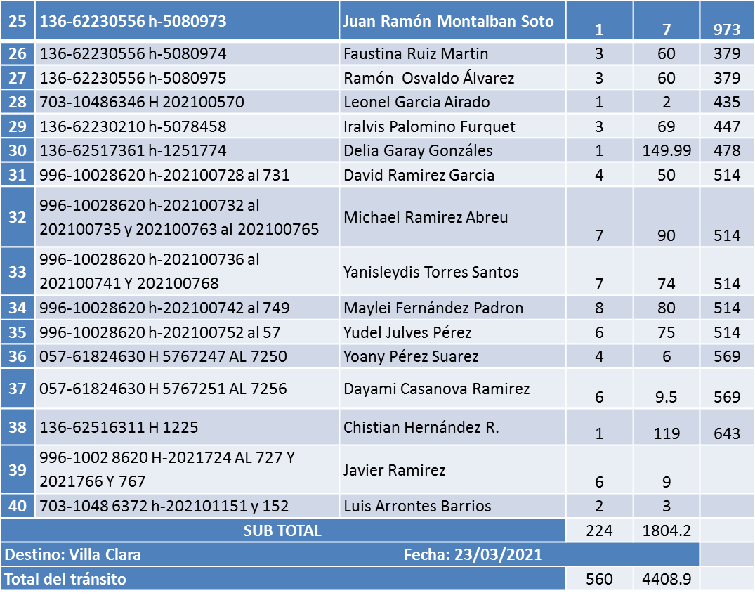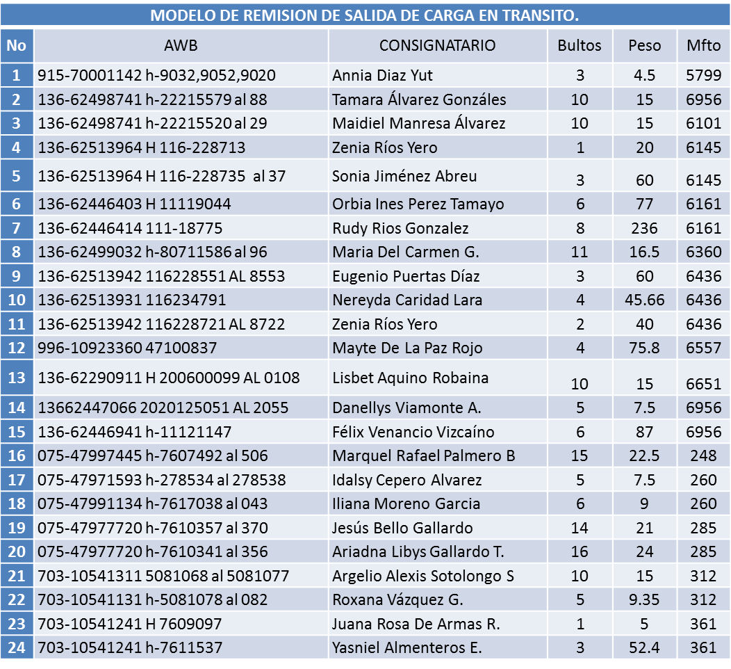 En una publicación de Facebook, Aerovaradero informó a los clientes residentes en las provincias de Cienfuegos, Sancti Spíritus, Matanzas y Villa Clara, la salida de una rastra, con las guías aéreas que se muestran en las imágenes: