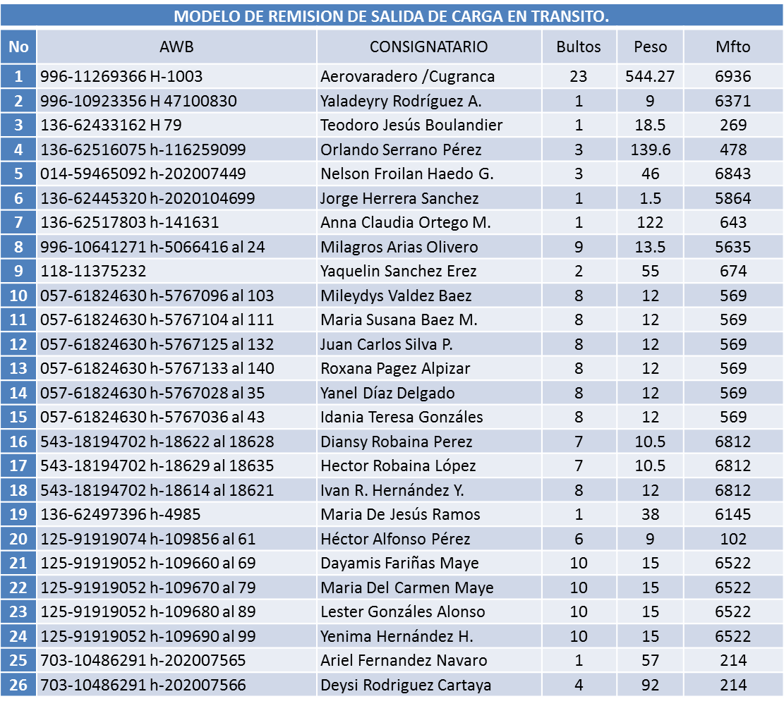 Aerovaradero, la empresa cubana especializada en la actividad de carga aérea nacional e internacional, informó sobre el despacho de varias cargas no acompañadas a diferentes provincias del país.
