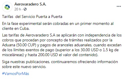 “En la fase experimental serán cobradas en un primer momento al cliente en Cuba. Las tarifas de Aerovaradero S.A se aplicarán con independencia de los cobros que procedan por concepto de trámites realizados por la Aduana (50.00 CUP) y pagos de aranceles aduanales, cuando excedan de los límites exentos de pago (superior a los 30.00 USD o 1.5 kg de misceláneas) y hasta 200.00 USD el valor del contenido)”, dice el informe.
