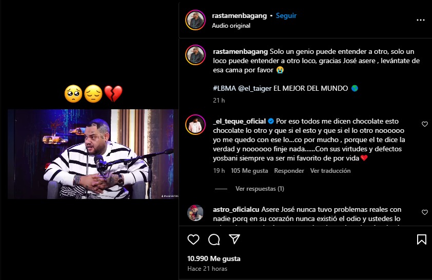 “Solo un genio puede entender a otro, solo un loco puede entender a otro loco. Gracias José, asere, levántate de esa cama por favor”, escribió el autodenominado ‘Rey del Reparto’ en su última publicación al respecto.
