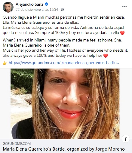 “Cuando llegué a Miami muchas personas me hicieron sentir en casa. Ella, María Elena Guerreiro, es una de ellas. La música es su trabajo y su forma de vida. Anfitriona de todo aquel que lo necesitara. Siempre al 100% y hoy nos toca ayudarla a ella”, escribió Alejandro Sanz en su cuenta en Facebook.