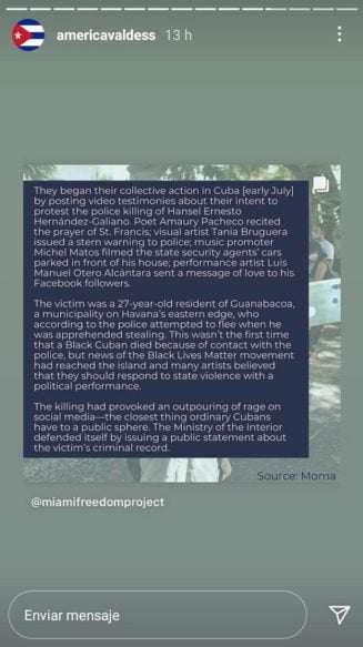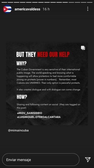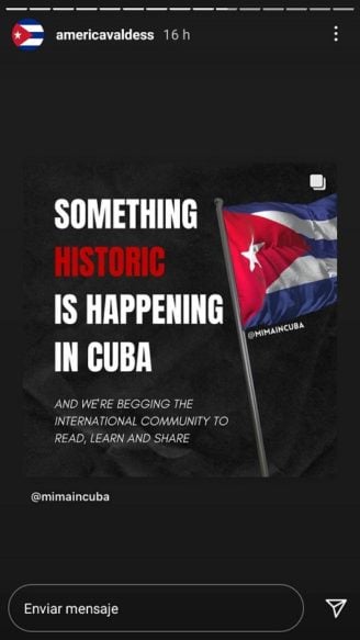 La joven que siempre ha mantenido una postura crítica hacia la represión y las carencias en la Isla, ahora a raíz de los hechos contra el MSI, también compartió en sus historias imágenes explicando en inglés lo sucedido para informar a sus seguidores.