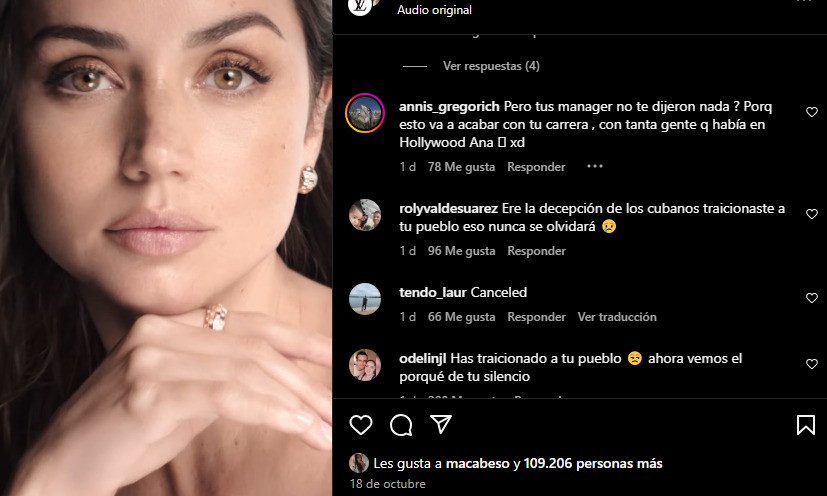 De Armas solo dejó los comentarios disponibles en la publicación donde se muestra como embajadora de la marca de lujo Louis Vuitton, y aunque ostenta este cargo desde hace varios meses, fue ahora con su reciente escándalo que los cubanos solicitaron a la marca retirar a la actriz como su representante internacional.