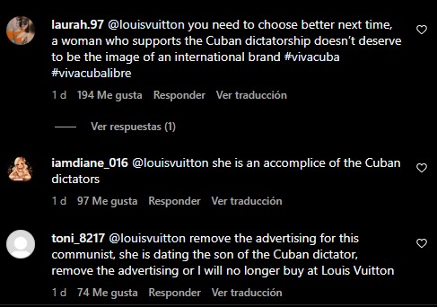 “Esta marca está manchada de sangre por la dictadura, cómplices”; “Ustedes también apoyan a la dictadura cubana”; “Una comunista infiltrada en USA. Afuera todo el mundo sabe quién es ella. No compro más nunca Estée Lauder”; “Vergüenza debería darles apoyar a alguien que está relacionada con la opresión y la situación que vive el pueblo de Cuba”; “Es una absoluta vergüenza tener a esta mujer como imagen”; “Una cubana que apoya el régimen no se merece ser imagen de esta marca”, fueron algunos de los comentarios.