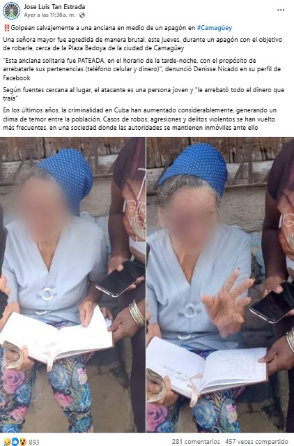 Una mujer de avanzada edad fue violentamente atacada el pasado jueves 6 de febrero en las inmediaciones de la Plaza Bedoya, en la ciudad de Camagüey, durante un prolongado corte de electricidad. La agresión tuvo como objetivo el robo de sus pertenencias.