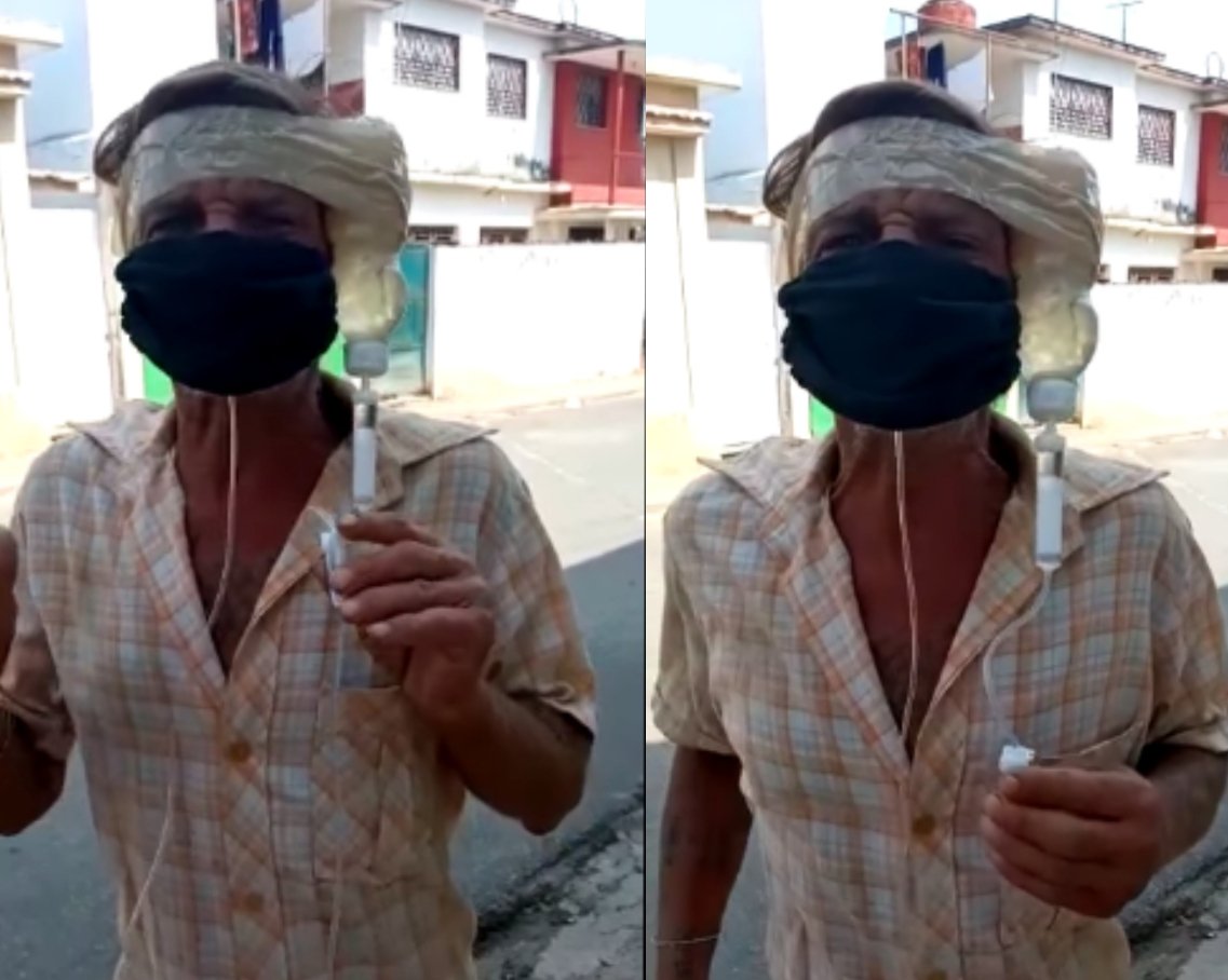 El hombre, identificado como Rafael Puente Cruz, salió a la calle portando su nasobuco y además una botella de agua, sujeta a la cabeza mediante una cinta, de la cual salía una manguera (usada en centros médicos para venoclisis) que iba directo a su boca, la cual controlaba mediante la llave reguladora del equipo.