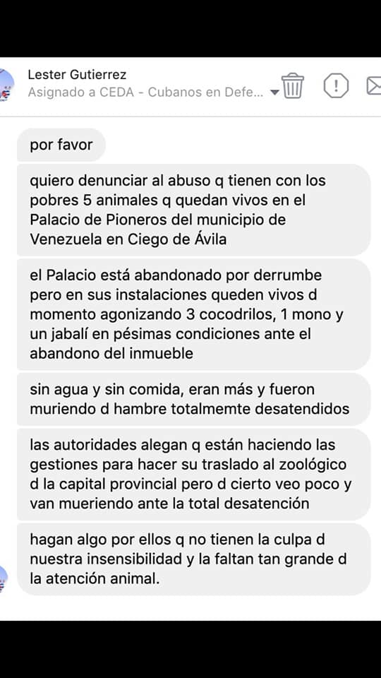 “El palacio ya no funciona hace 5 años, los animales no son atendidos y han ido muriendo. Quedan 3 cocodrilos, 1 jabalí y 1 mono en condiciones deplorables que no son atendidos, ni alimentados”, se lee en la denuncia publicada en el grupo de Facebook Cuba contra el maltrato animal.
