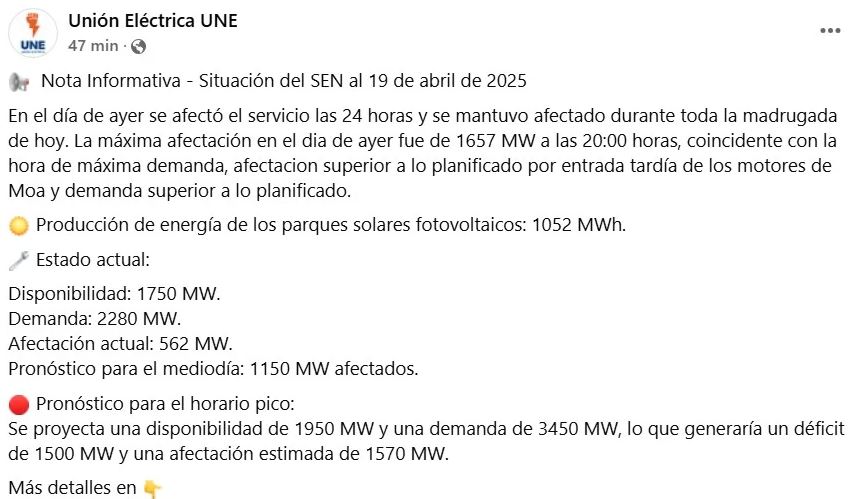 Según el último reporte de la Unión Eléctrica de Cuba (UNE), el Sistema Eléctrico Nacional (SEN) enfrenta este sábado una jornada particularmente crítica.