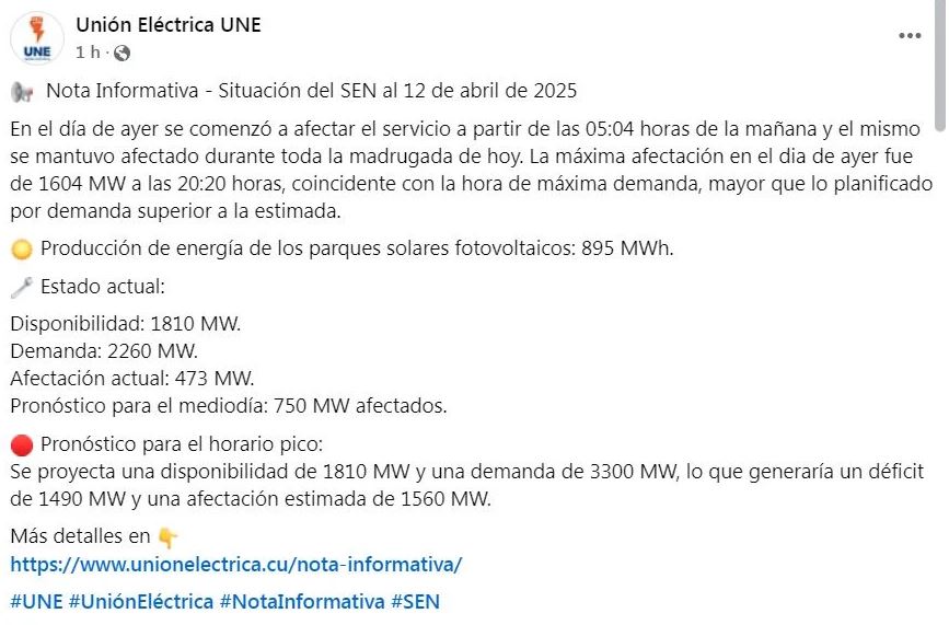 De acuerdo con el último reporte de la estatal Unión Eléctrica de Cuba (UNE), el Sistema Eléctrico Nacional (SEN) de Cuba enfrenta este sábado una situación compleja, con una afectación máxima prevista de 1.560 MW en el horario pico.
