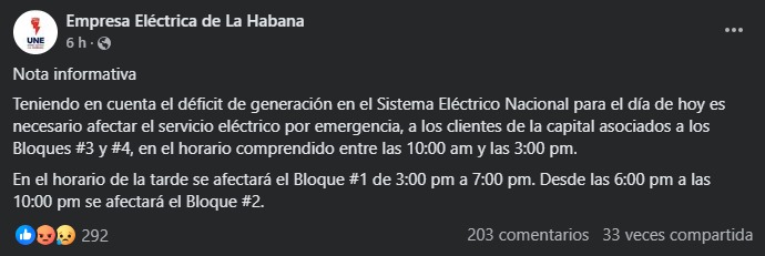 Según la nota informativa publicada por la entidad en su perfil oficial de Facebook, los primeros Bloques afectados por los cortes serán los #3 y #4 de la ciudad entre las 10:00 am y las 3:00 pm.