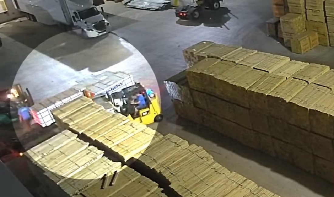 Un video compartido por la prensa muestra el momento exacto en el que el par de empleados de la empresa estacionaron una camioneta y utilizaron un montacargas para mover las pesadas cajas.