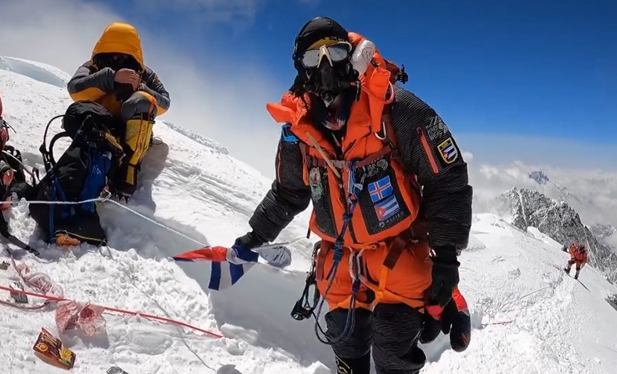 El video muestra a Núñez escalando el último tramo de la montaña más alta del mundo, colocando una pequeña bandera cubana a más de 8.800 metros de altura.