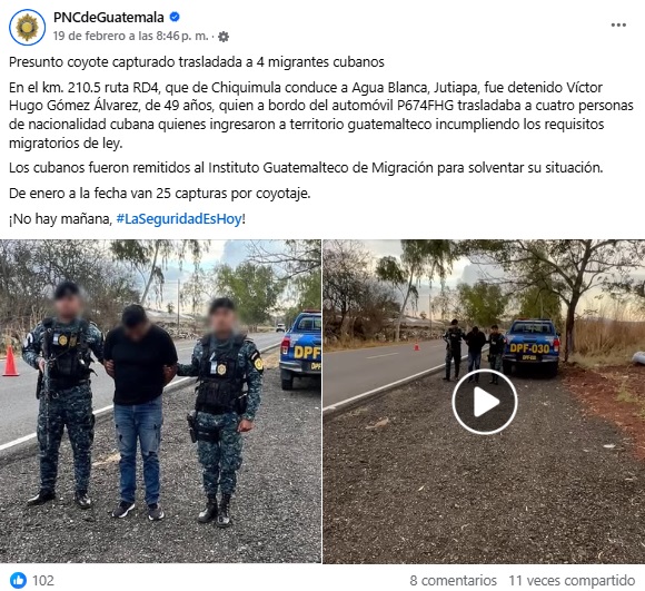 La Policía Nacional Civil (PNC) confirmó el miércoles 19 de febrero la detención de Víctor Hugo Gómez Álvarez, de 49 años de edad, quien conducía un vehículo en el que viajaban los migrantes cubanos sin haber cumplido los requisitos legales de entrada al territorio.