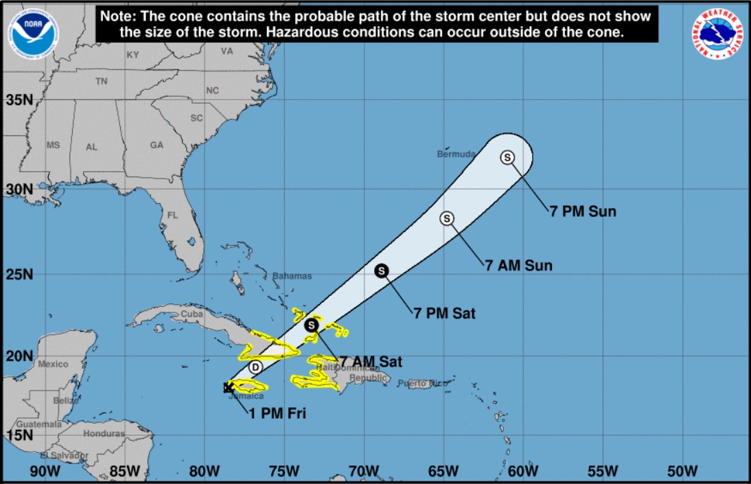 Se espera que el centro del sistema atraviese Jamaica este viernes, el sureste de Cuba el sábado durante la mañana, y luego llegue a las Bahamas y las Islas Turcas y Caicos durante la tarde y noche.
