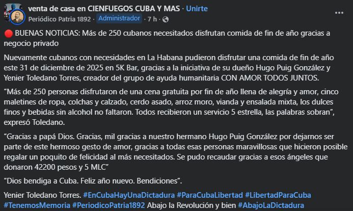 Más de 250 cubanos en situación de vulnerabilidad pudieron recibir una comida especial de fin de año el 31 de diciembre de 2025 en La Habana, gracias a una acción solidaria organizada por el negocio privado 5K Bar y el proyecto de ayuda humanitaria “Con Amor Todos Juntos”.