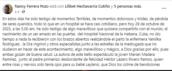 “En estos días he sido testigo de momentos terribles, de momentos dolorosos y tristes, de pérdida de seres queridos, todo lo que en un hospital se hace casi cotidiano, pero hoy 28 de octubre de 2023, a las 5.00 a.m., he sido testigo de algo maravilloso que quisiera compartirlo con el mundo, el nacimiento de un ser amado en las puertas del Hospital Nacional de la Habana”, se lee en una publicación compartida por la internauta Nancy Ferrera Pozo.