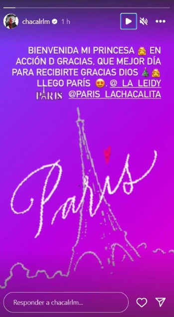 “Bienvenida mi princesa en Acción de Gracias. Qué mejor día para recibirte. Gracias Dios. Llegó Paris”, expresó El Chacal en una story de Instagram.