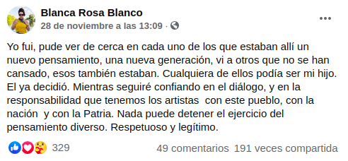 “Mientras, seguiré confiando en el diálogo, y en la responsabilidad que tenemos los artistas con este pueblo, con la nación y con la Patria. Nada puede detener el ejercicio del pensamiento diverso. Respetuoso y legítimo”, añadió Blanca Rosa.
