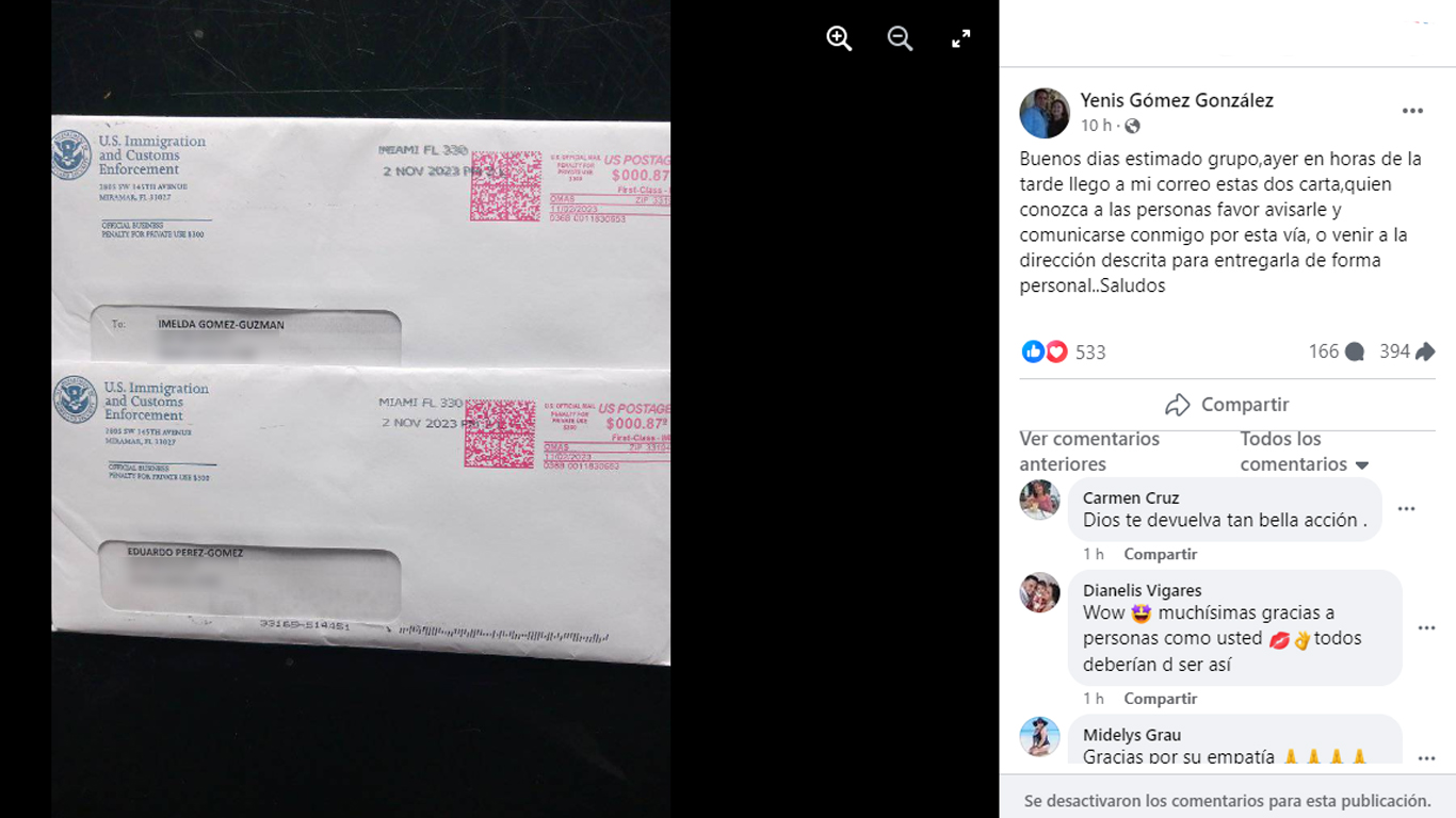 La mujer, identificada como Yenis Gómez González, acudió al grupo de Facebook ‘I220A con y sin fecha de corte Ajuste Cubano’ para solicitar ayuda encontrando a los dueños de estas cartas, pues sabe que cualquier correo enviado por ICE podría ser de gran importancia para ellos.