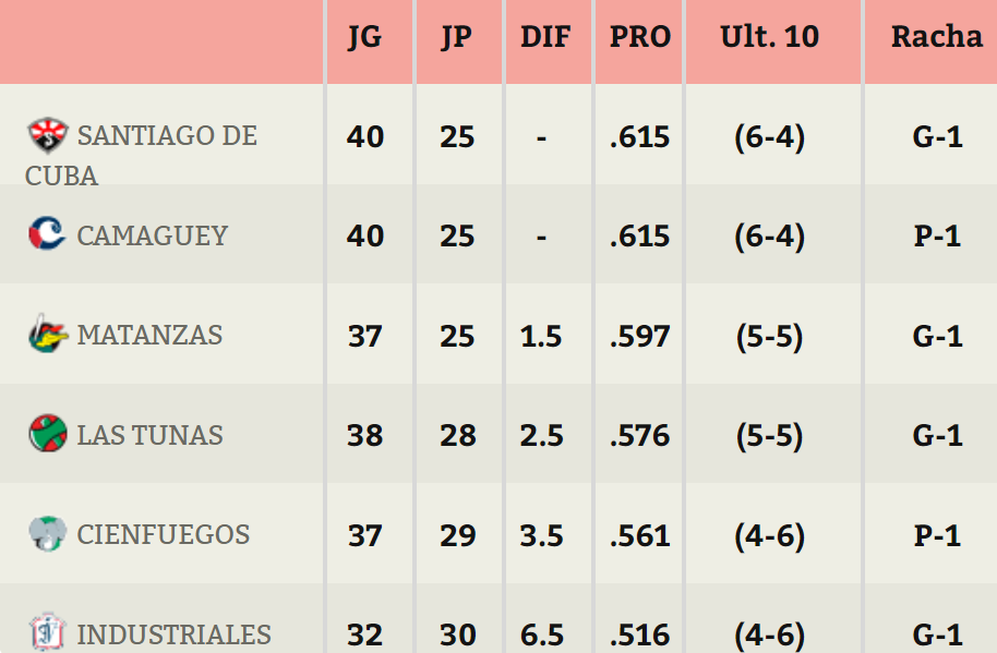 La segunda fase de seis equipos de la 59 Serie Nacional de Béisbol marcha a paso firme hacia su finalización antes de que culmine el año y dos equipos, que en los últimos años no están en esos términos. Lideran la tabla de posiciones. Son ellos Santiago de Cuba y Camagüey.