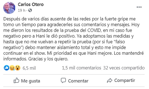 “Ya adoptamos las medidas y hasta que no me vuelvan a repetir la prueba (por si fue “falso negativo”) debo mantener aislamiento total y esto me impide continuar en el show. Mi prioridad es que Hani mejore. Los mantendré informados. Gracias y los quiero”.