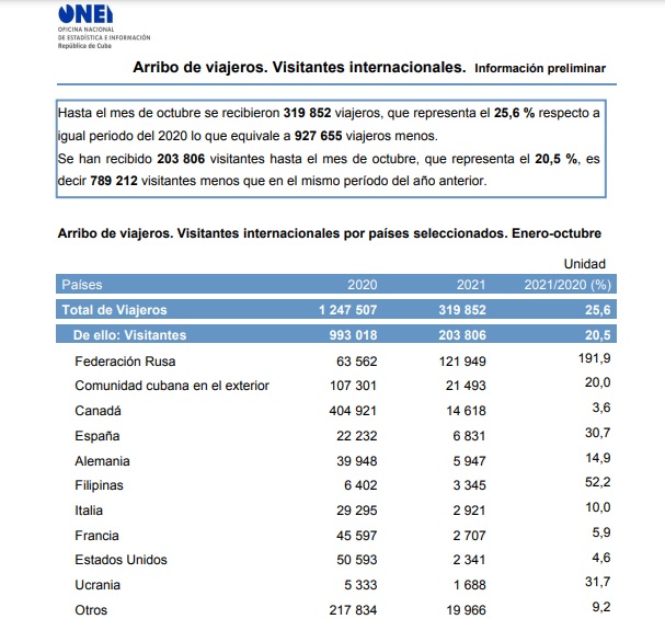 De acuerdo con el documento de la ONEI, Cuba recibió hasta octubre de este año 319 mil 852 viajeros, lo cual representa el 25,6% del total de turistas recibidos en el mismo lapso de tiempo en el año 2020.