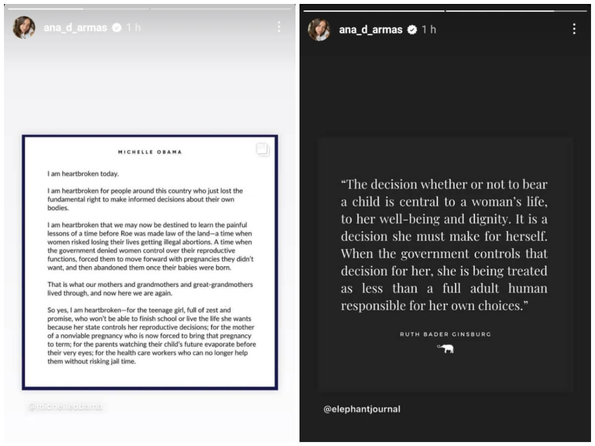 Otra de las que tomó postura fue la actriz cubanoamericana Ana de Armas, quien también compartió en sus historias el comunicado de la ex primera dama.