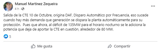 “Salida de la CTE 10 de Octubre, origina DAF, Disparo Automático por Frecuencia, eso sucede cuando hay más demanda que generación se dispara la planta automáticamente para su protección. Pues que ahora, al déficit de 135MW para el horario nocturno se le adiciona la potencia que deja de aportar la CTE en cuestión, alrededor de 80 MW”, indicó un especialista de Las Tunas.