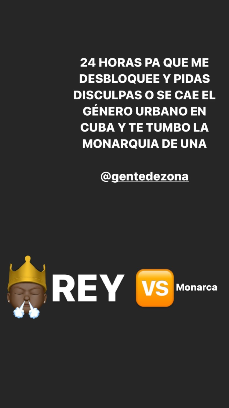 “Veinticuatro horas para que me desbloquees y pidas disculpas o se cae el género urbano en Cuba y te tumbo la monarquía de una. Rey vs. Monarca”, sentenció el reguetonero.
