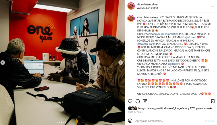 Chocolate compartió ahí mismo fotografías desde las oficinas de OneRpm, una importante empresa dedicada a la difusión de música en plataforma digital, con la cual firmó el acuerdo.