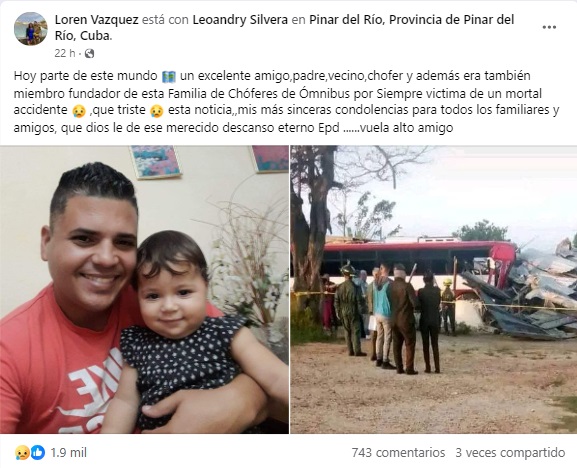 “Hoy parte de este mundo un excelente amigo, padre, vecino y chófer, que además era también miembro fundador de esta familia de ‘Chóferes de Ómnibus por Siempre’, víctima de un mortal accidente”, se lee en el post compartido por el usuario Loren Vázquez.