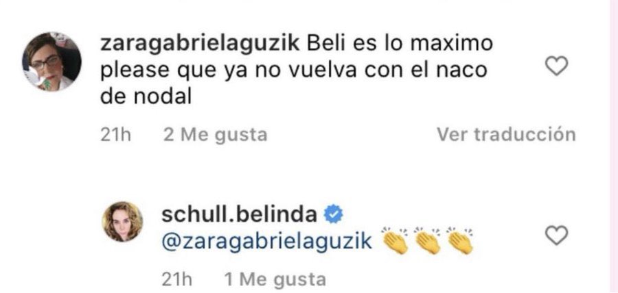 Luego de que una fan de la también actriz escribiera que “Beli es lo máximo” y que esperaba que “no regrese con el naco de Nodal”, la mujer reaccionó al comentario con un like, y respondiendo con unos emojis de aplausos.