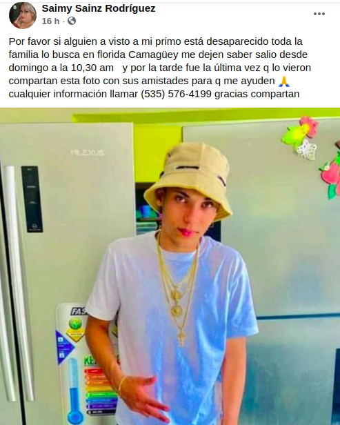Por su parte, la usuaria Saimy Sainz Rodríguez, quien se identificó como prima del desaparecido, confirmó la noticia y se unió al pedido para encontrar al joven.