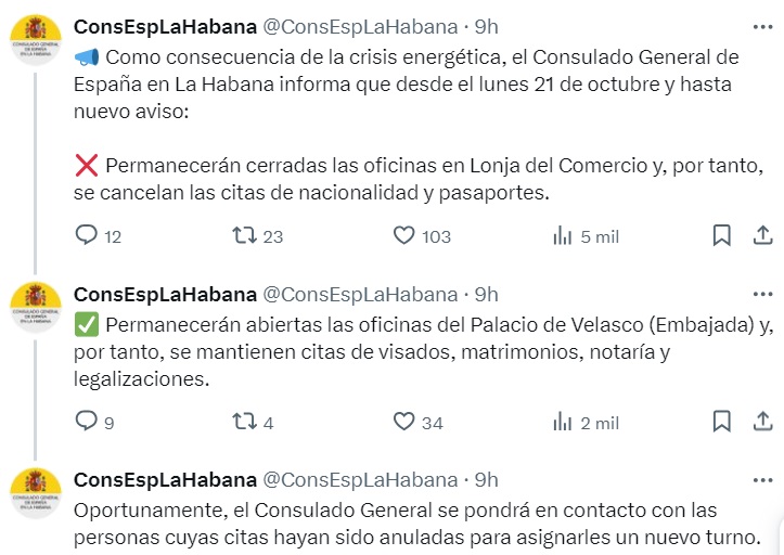 Para este lunes 21 de octubre, el Consulado de España en Cuba ya había programado la atención de 326 personas adicionales por semana para los trámites relacionados con la Ley de Memoria Democrática, un incremento del 37,33 % en la capacidad de procesamiento, pero estos planes se han suspendido debido a la crisis energética en el país.