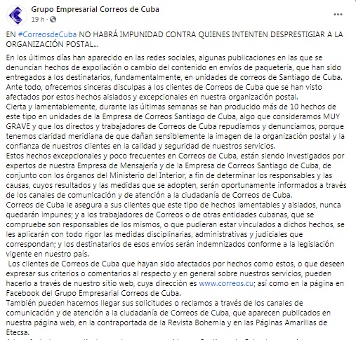 “Correos de Cuba le asegura a sus clientes que este tipo de hechos lamentables y aislados, nunca quedarán impunes; y a los trabajadores de Correos o de otras entidades cubanas, que se compruebe son responsables de los mismos, o que pudieran estar vinculados a dichos hechos, se les aplicarán con todo rigor las medidas disciplinarias, administrativas y judiciales que correspondan; y los destinatarios de esos envíos serán indemnizados conforme a la legislación vigente en nuestro país”, continuó el comunicado.