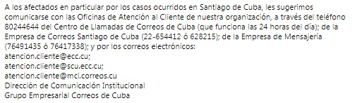 Los “resultados y las medidas que se adopten, serán oportunamente informados a través de los canales de comunicación y de atención a la ciudadanía de Correos de Cuba”.