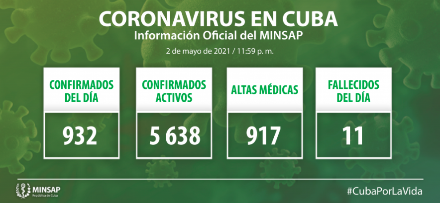 El Ministerio de Salud Pública de Cuba (MINSAP) reportó al cierre de este 2 de mayo 932 nuevos casos confirmados de Covid-19 para un total de 109 mil 615 contagios desde el inicio de la pandemia en marzo del año pasado.