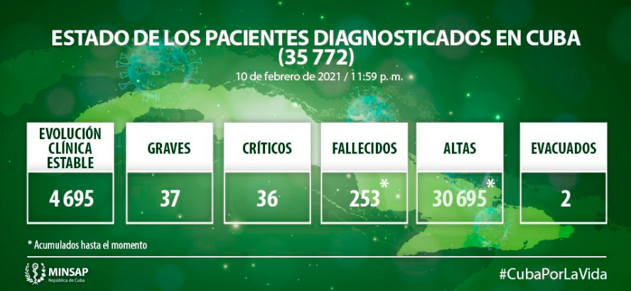 El Ministerio de Salud Pública de Cuba (MINSAP) reportó al cierre del 10 de febrero, 850 casos nuevos de COVID-19 para un total de 35 mil 722 contagios desde el inicio de la pandemia en marzo del año pasado.
