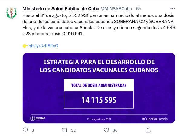 Según la información, hasta el 31 de agosto se han distribuido un total de 14 115 595. Del total de personas intervenidas, 5 552 931 han recibido al menos una dosis de uno de los candidatos vacunales cubanos, Soberana 02, Plus y Abdala.