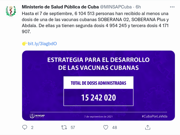 De acuerdo con la información ofrecida por el Ministerio de Salud Pública, hasta el 7 de septiembre se han distribuido un total de 15 242 020. Del total de personas inmunizadas, 6 104 513 han recibido al menos una dosis de uno de los candidatos vacunales cubanos, Soberana 02, Plus y Abdala.