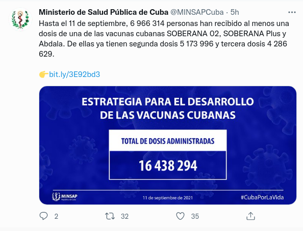 Según la información ofrecida por el Ministerio de Salud Pública (MINSAP), hasta el 11 de septiembre se han administrado un total de 16 438 294. Del total de personas inmunizadas, 6 966 314 han recibido al menos una dosis de uno de los candidatos vacunales cubanos, Soberana 02, Plus y Abdala.