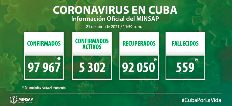 El Ministerio de Salud Pública de Cuba (MINSAP) reportó al cierre de este 21 de abril 1207 nuevos casos confirmados de Covid-19 para un total de 97 mil 967 contagios desde el inicio de la pandemia en marzo del año pasado.